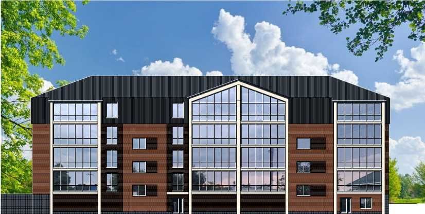 Будинок 4-поверховий з червоної цегли, зовнішнє утеплення стін мінеральною ватою, цокольний поверх з паркінгом.