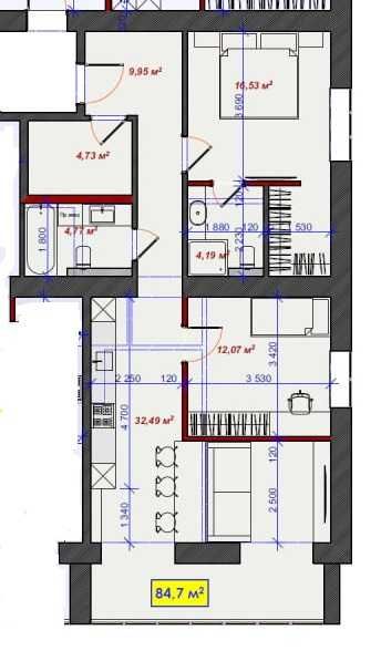 Загальна площа квартири 85кв.м, висота стель 2.7м, панорамні енергоефективні вікна, автономне газове опалення. Згідно проєкту передбачається 2 житлові кімнати: майстер-спальня з власним санвузлом, кабінет або друга спальня, простора кухня-студія площею 32кв.м, ванна кімната. Можливе перепланування під вимоги інвестора. Також у забудовника присутня опція ремонту під ключ згідно готового дизайн-проекту.
