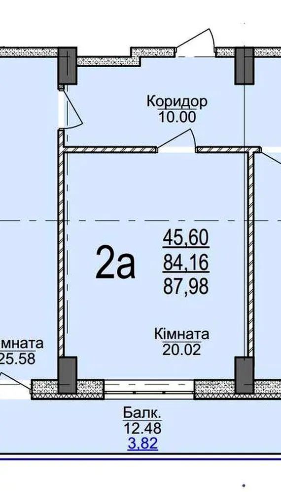 Квартира типу 2А з роздільним плануванням. Вітальня, кімната та кухня мають вихід на балкон. Стан квартири після будівельників. Висота стелі 2,75 м.