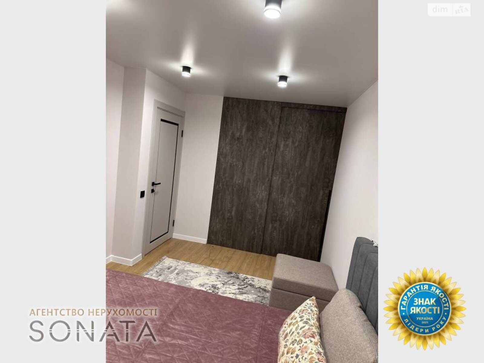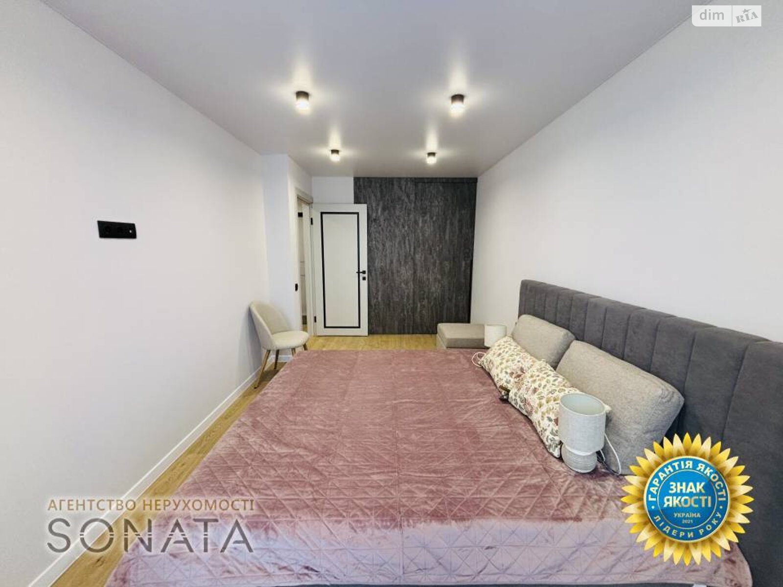 Спальна кімната облаштована великим ліжком із ортопедичним матрацом, а велика вбудована гардеробна шафа дає можливість розмістити всі речі майбутніх власників.