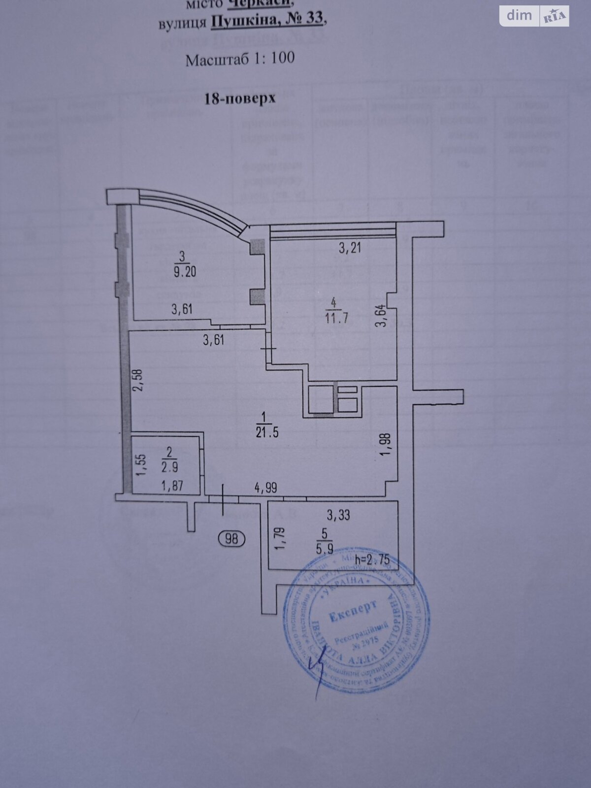 Висота стелі: 2, 75 м