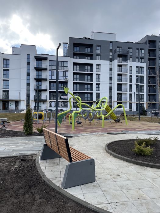 Двір та благоустрій на єтапі завершення, встановлені дитячі, спортивні майданчики та зони відпочинку.
