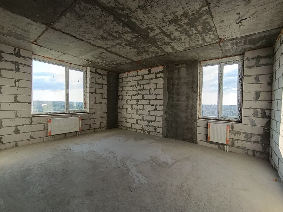 Стан квартири "після будівельників": зроблена стяжка підлоги, встановлені радіатори, заведено 10 кВт електрики.
